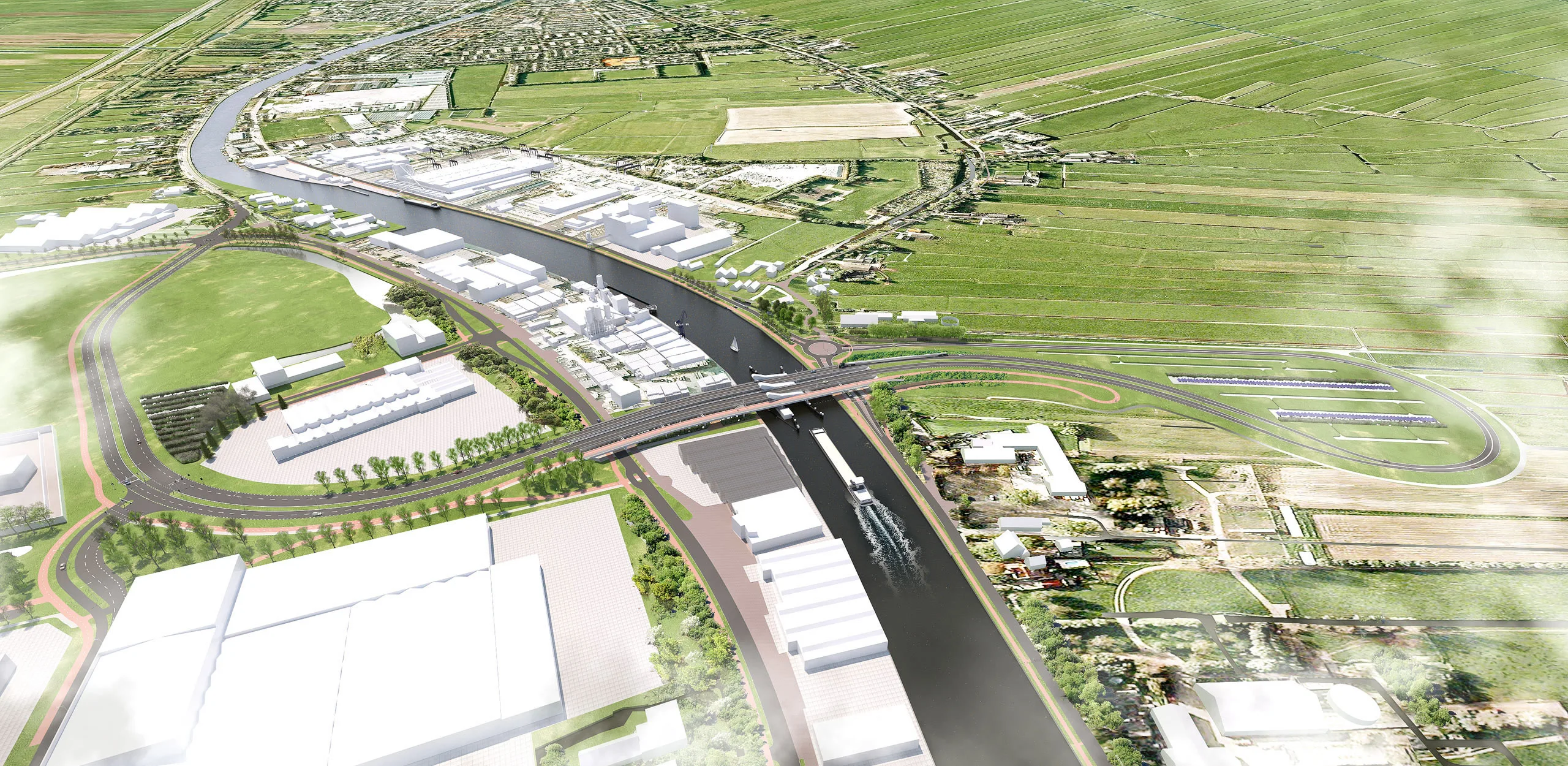 Het landschap rond de Koningin Máximabrug bestaat uit meerdere lagen. De oudste en meest natuurlijke is de Oude Rijn, met zijn slingerende loop. Daaromheen liggen de polders, met parallelle sloten haaks op de rivier.
