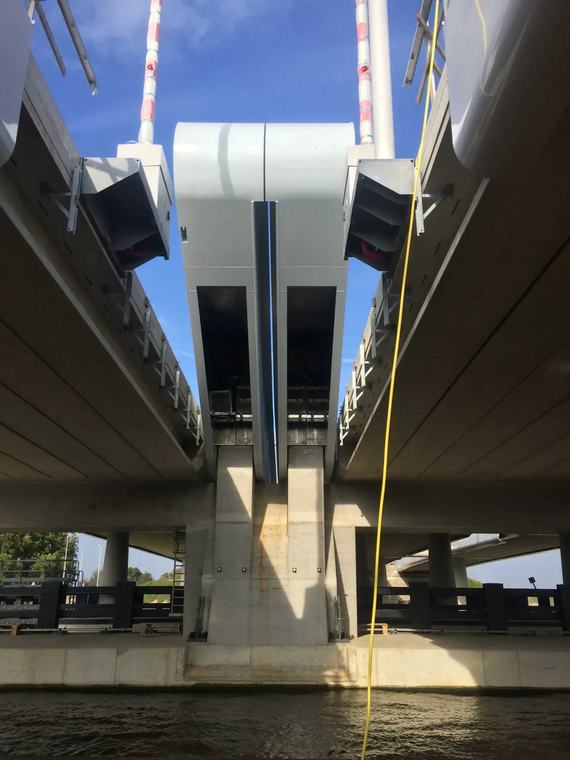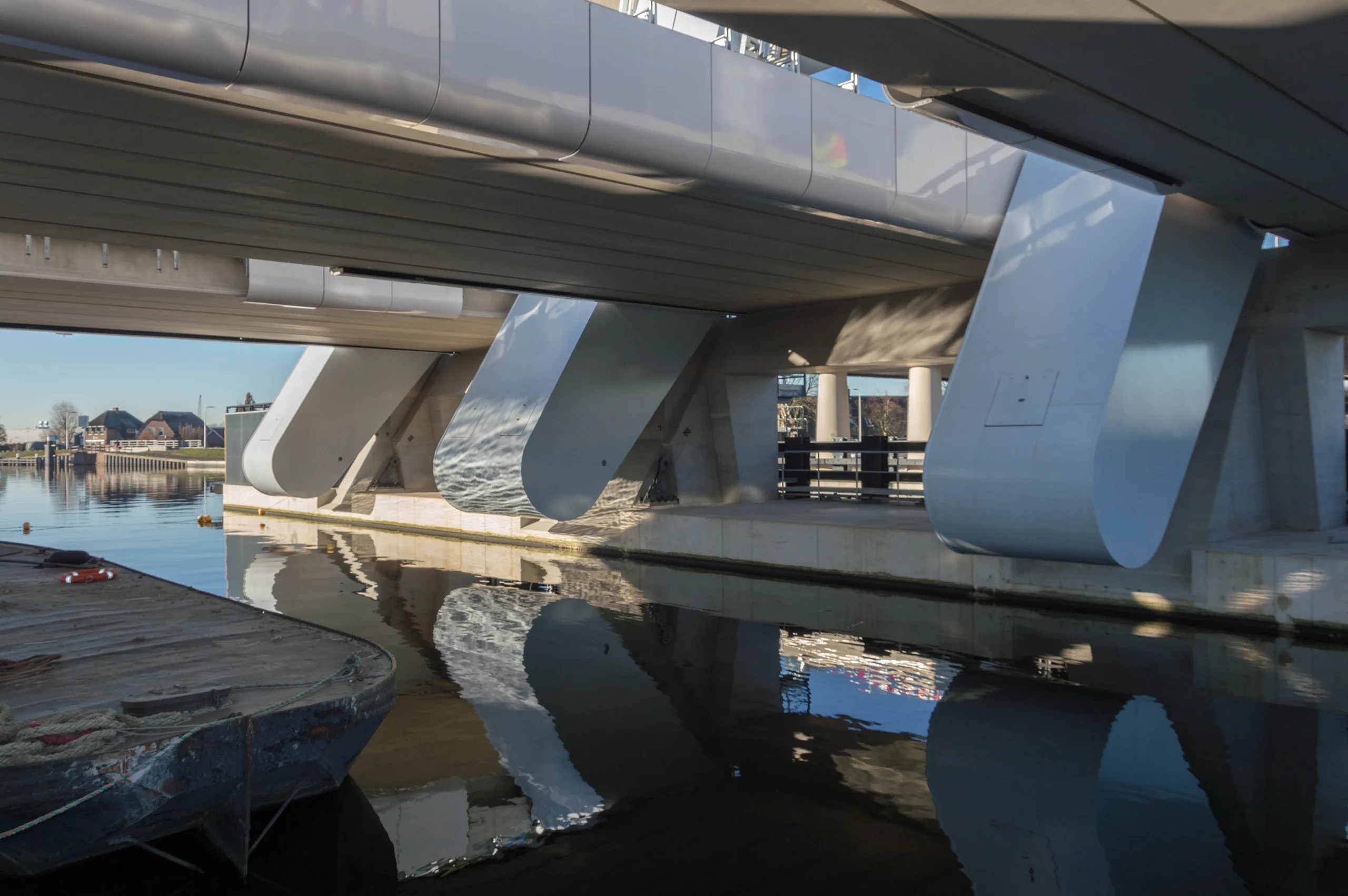 De Máxima brug is een staartbrug met hooggelegen stoere contragewichten, die draaien tussen de brugdekken door. De aanbruggen en het val lopen fraai gebogen in elkaar over. De kolommen zijn subtiel kegelvormig. Zo werkt alles samen en krijgt de brug een slanke belijning.