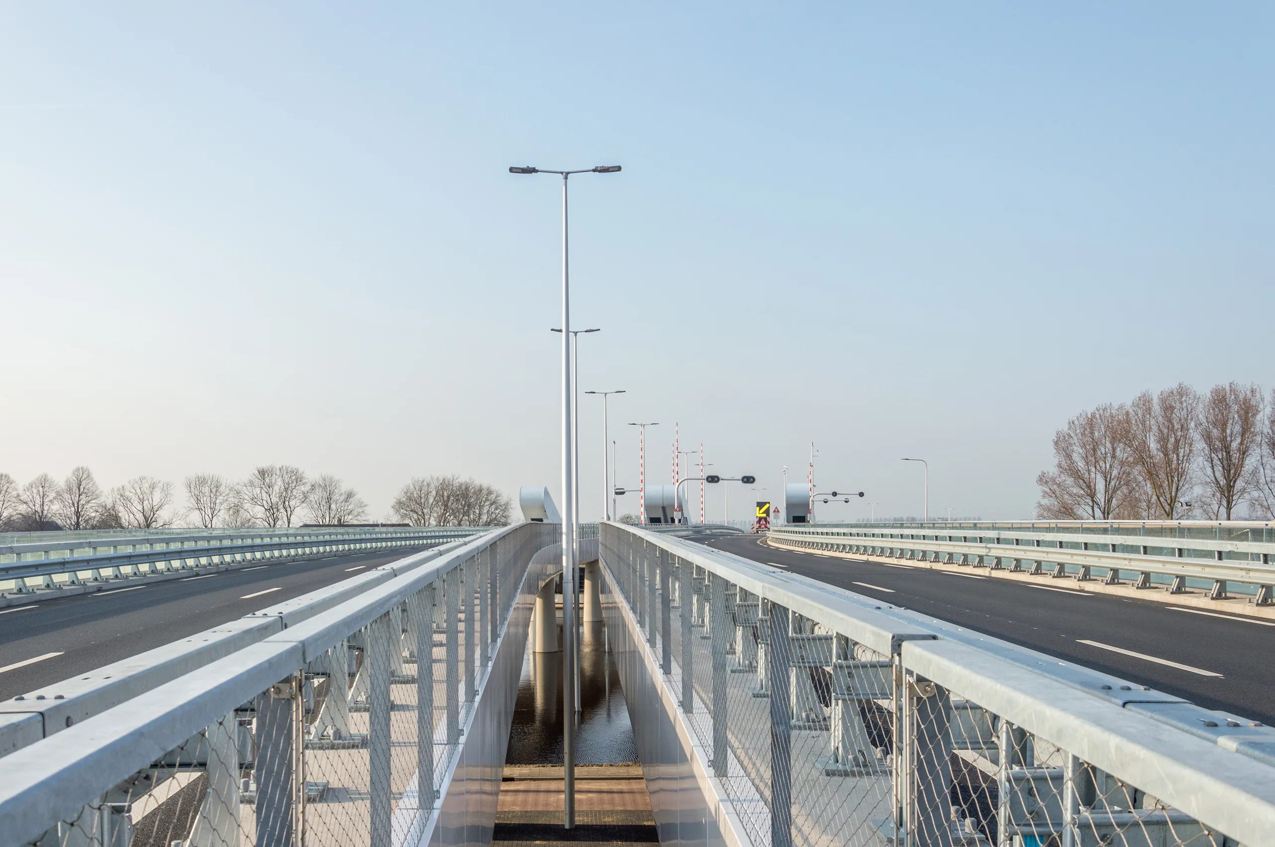 De noord/zuid-oriëntatie en de splitsing van de brugdekken zorgt voor een goede lichttoetreding en maakt het natte gebied onder de brug levensvatbaar, een prima paaiplaats voor vissen uit de Rijn. De aangeplante watervegetatie groeit hier prima en filtert het afstromend water van de brug.
