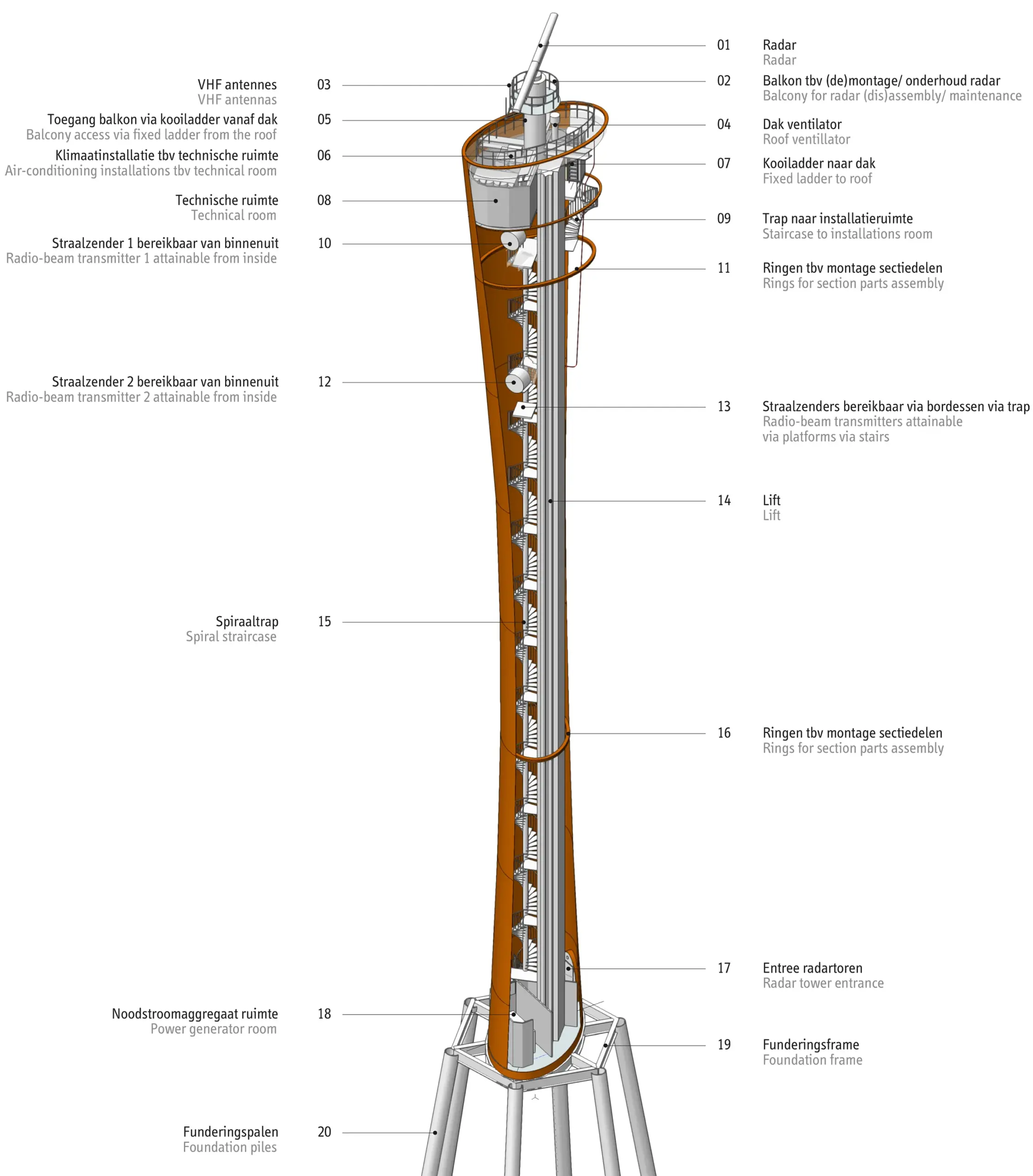 De Radartoren is een plateau voor radar, straalzenders, VHF antennes en camera’s. Desgewenst is de toren eenvoudig uit elkaar te halen en elders opnieuw op te bouwen, eventueel met een heel andere functie. De toren is bedacht en gebouwd met behulp van een integraal 3d model waar alle partijen in werkten. Hierdoor was het mogelijk om snel efficiënt en met een minimum aan fouten en problemen te ontwerpen en bouwen.